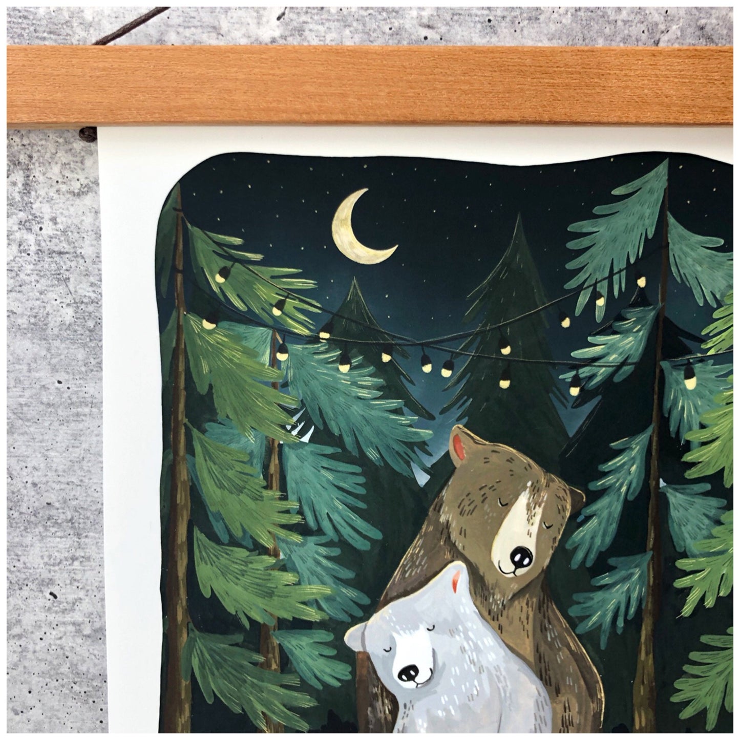 Night Forest Print (with the words "You're Here and You're Magical" written on it) is a reproduction of my original watercolor painting; I love painting bears and this is one of current favorite prints celebrating a newborn baby. Would make a great gift to expecting parents or to hang on a nursery wall.