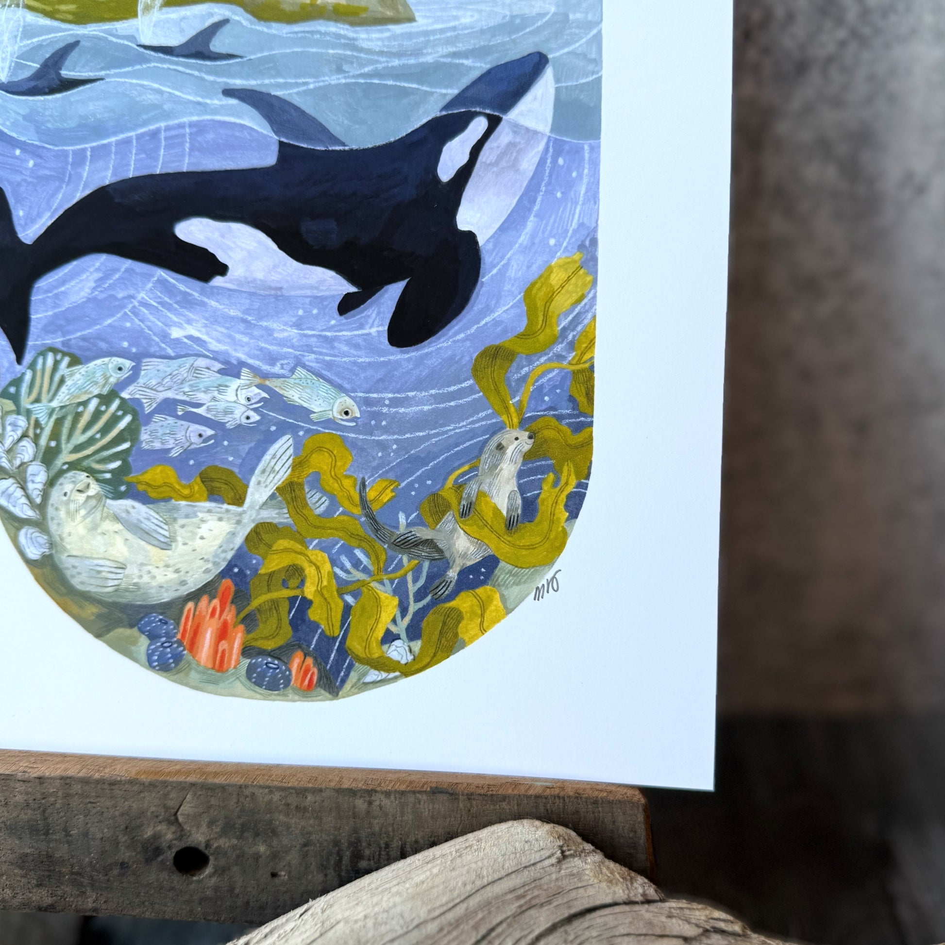 Marine Layer Print is a reproduction of my original gouache painting. Marine Layer is inspired by the Puget Sound and specifically Anacortes, WA as I was commissioned to design and paint this for the 2025 Anacortes Art Festival.