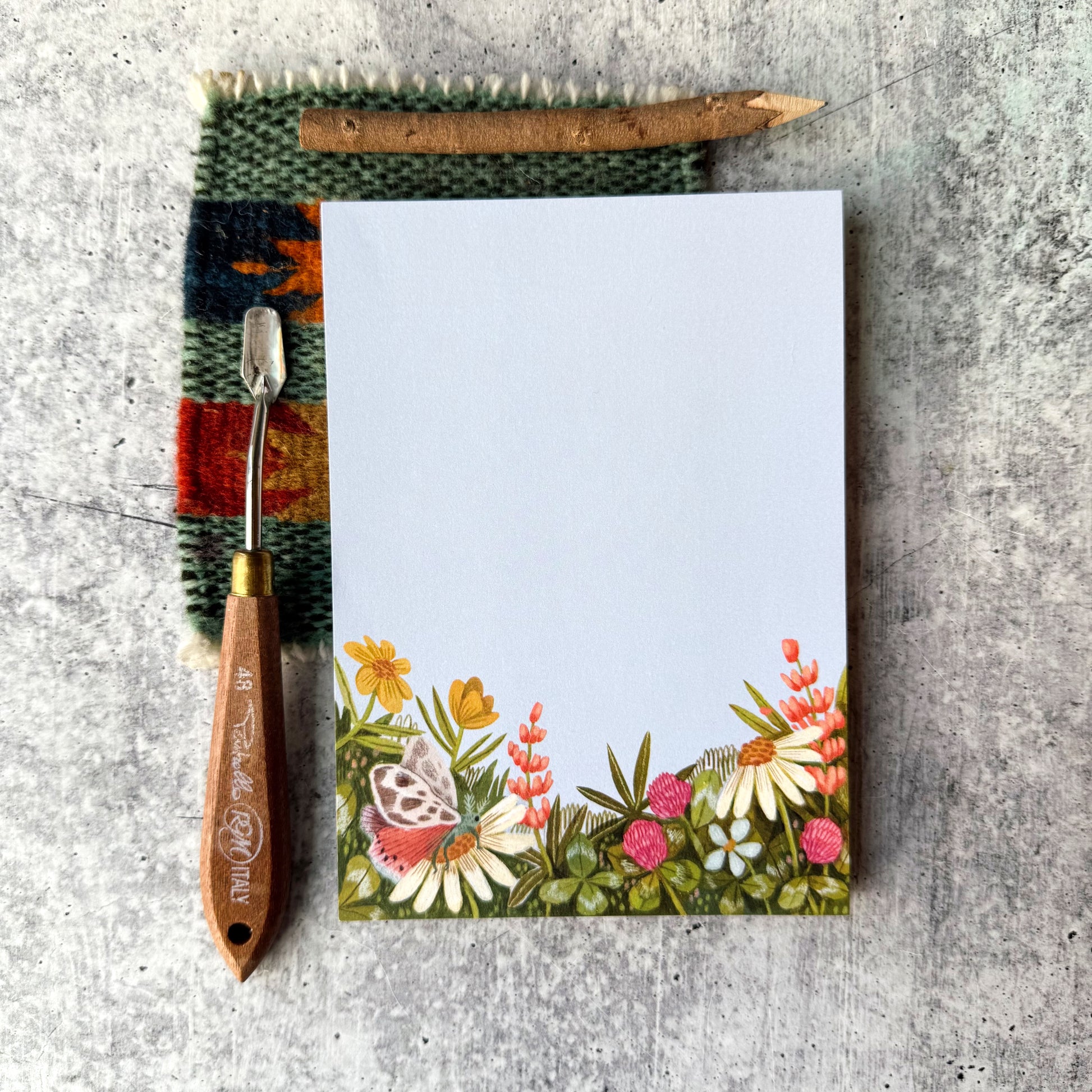 Wild Clover Notepad is a 50 page, 5”x7” notepad with a reproduction of my original painting of wild flowers, clover, and a butterfly.